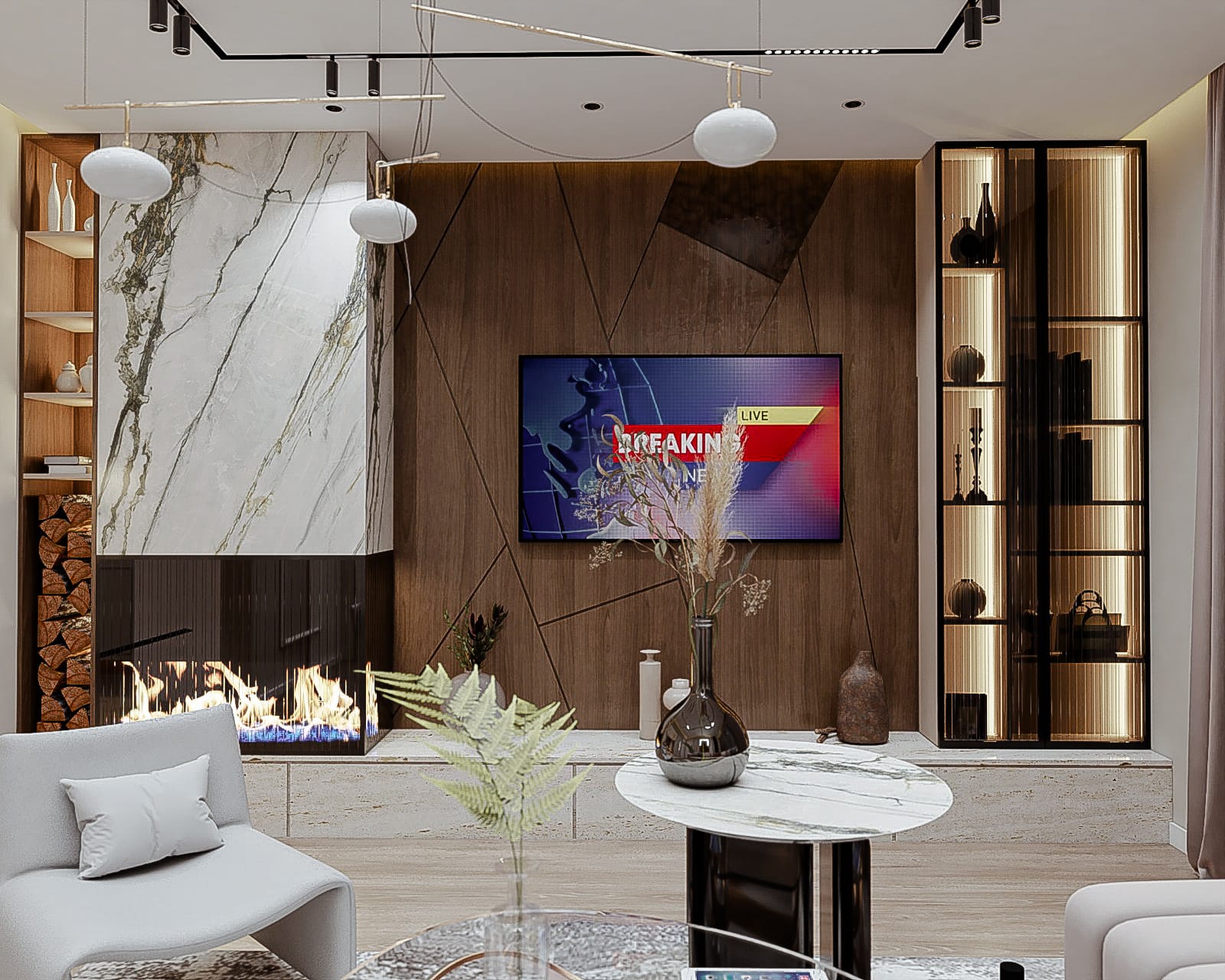 The apartment’s regular floor plan allowed for efficient spatial organization and a seamless design flow. Natural wood elements were introduced to add warmth and contrast, particularly in connection with the fireplace feature in the living area.