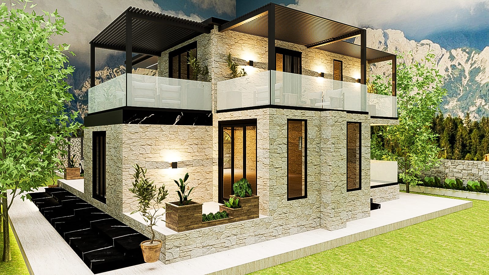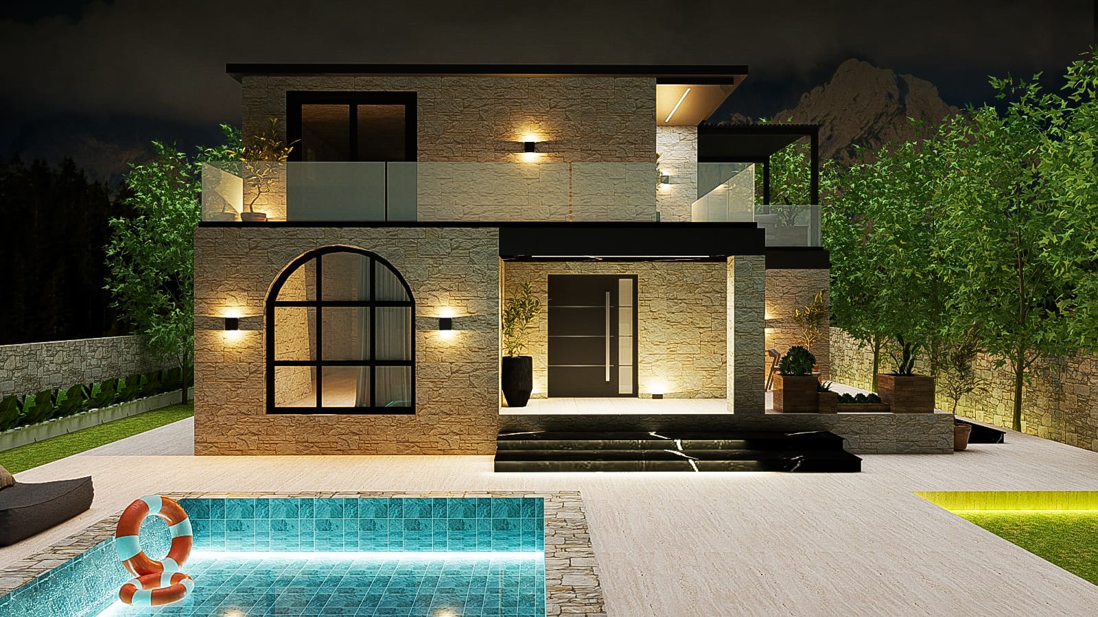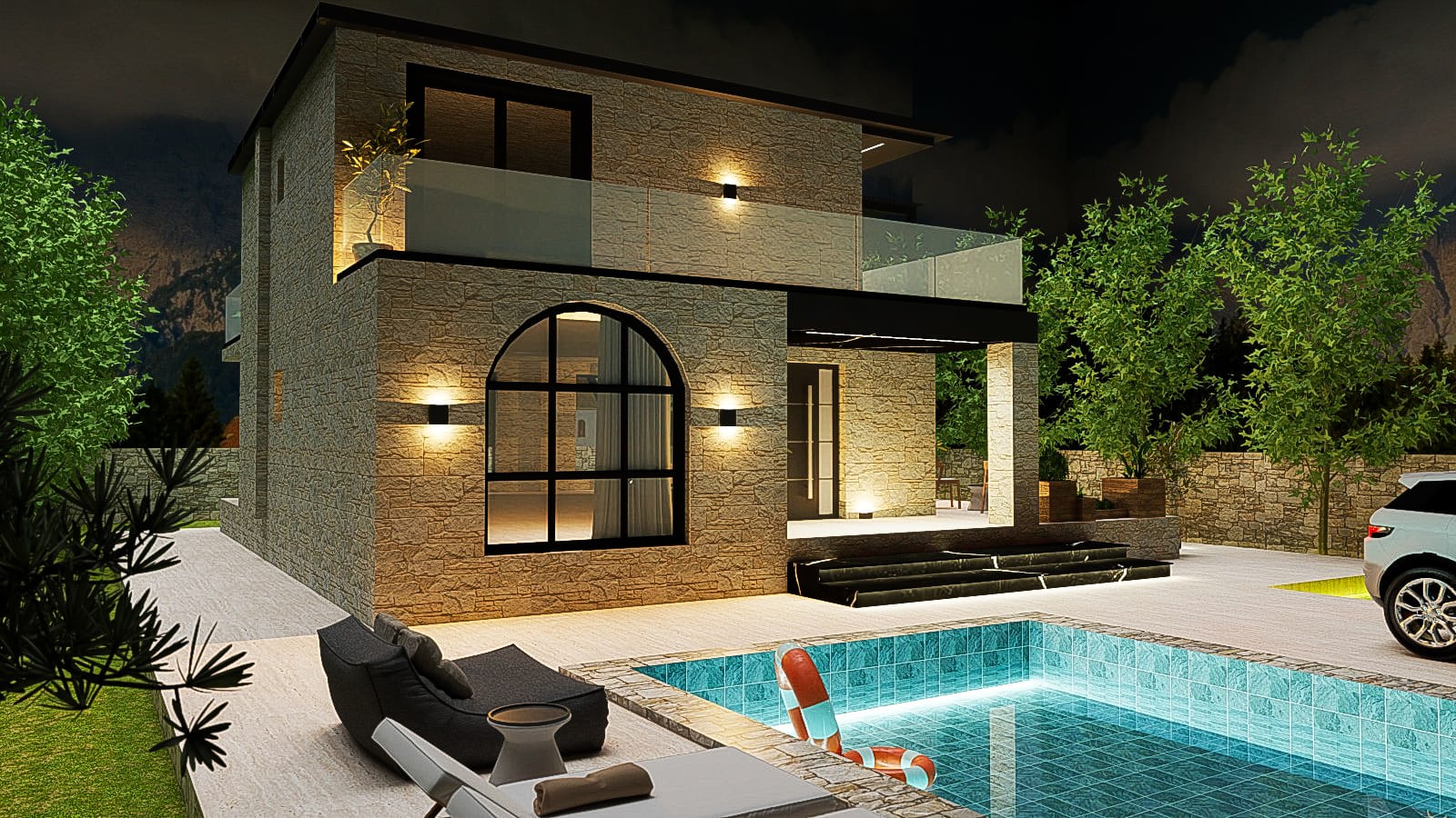 This project belongs to the city of Himara, a coastal tourist town located in southern Albania, currently considered its true gem. The project consists of the reconceptualization and redesign of a residential villa, with particular attention given to the decorative element of stone. The villa’s entire falsare is designed in stone, and it serves as a holiday home. The swimming pool is another beautiful feature that makes the villa even more attractive and suitable for enjoying its outdoor environment. The remaining outdoor area is treated with tall trees to create privacy and enhance the greenery.