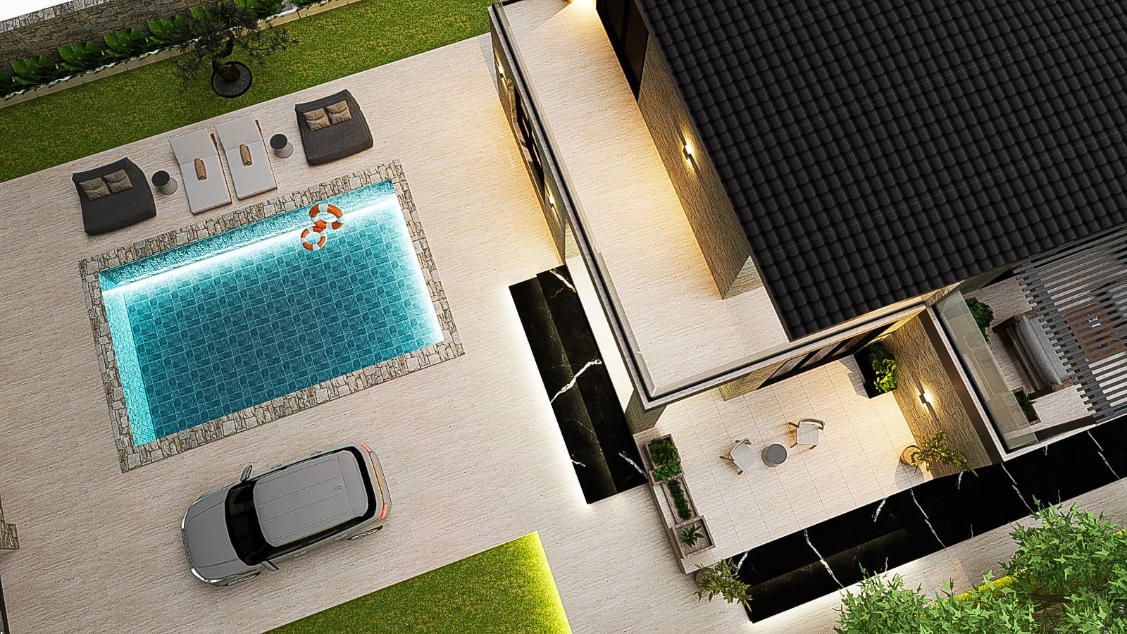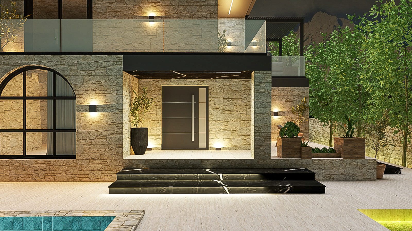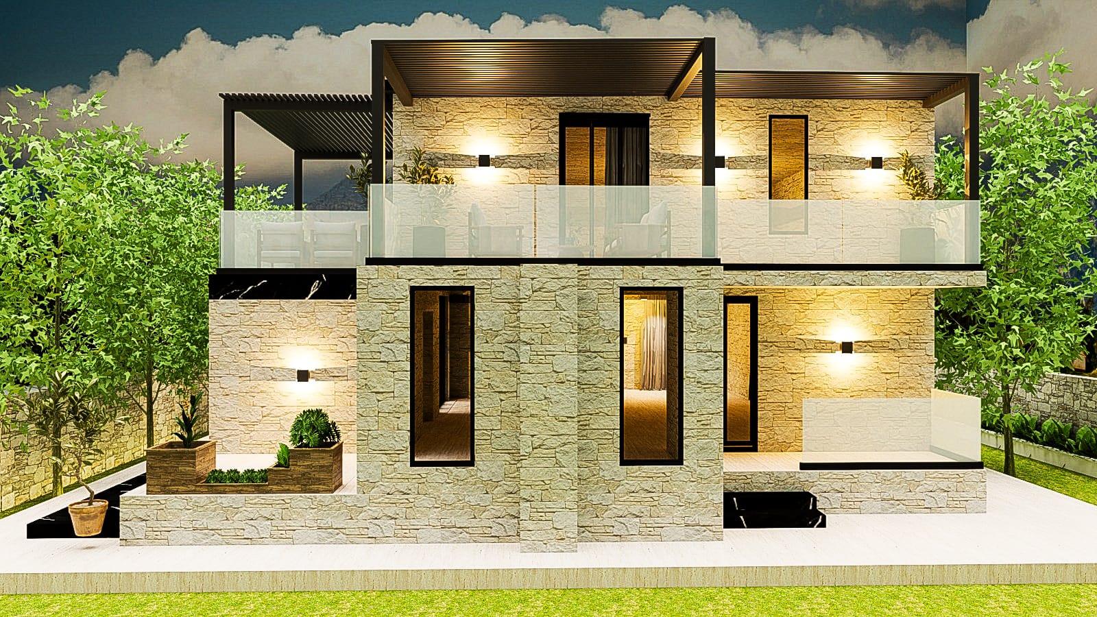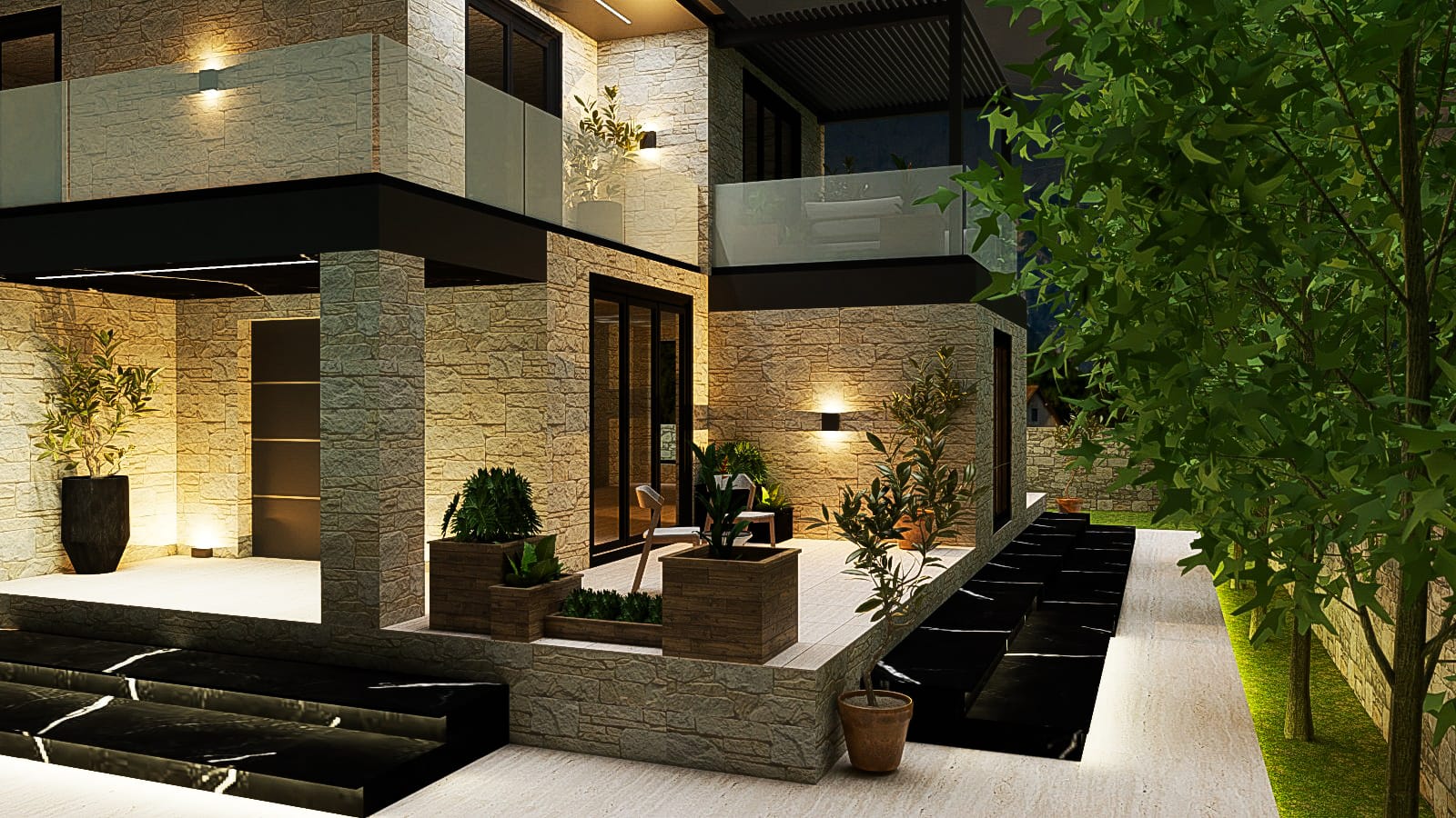 This project belongs to the city of Himara, a coastal tourist town located in southern Albania, currently considered its true gem. The project consists of the reconceptualization and redesign of a residential villa, with particular attention given to the decorative element of stone. The villa’s entire falsare is designed in stone, and it serves as a holiday home. The swimming pool is another beautiful feature that makes the villa even more attractive and suitable for enjoying its outdoor environment. The remaining outdoor area is treated with tall trees to create privacy and enhance the greenery.